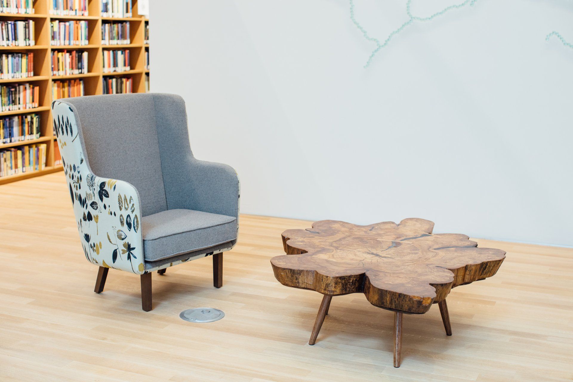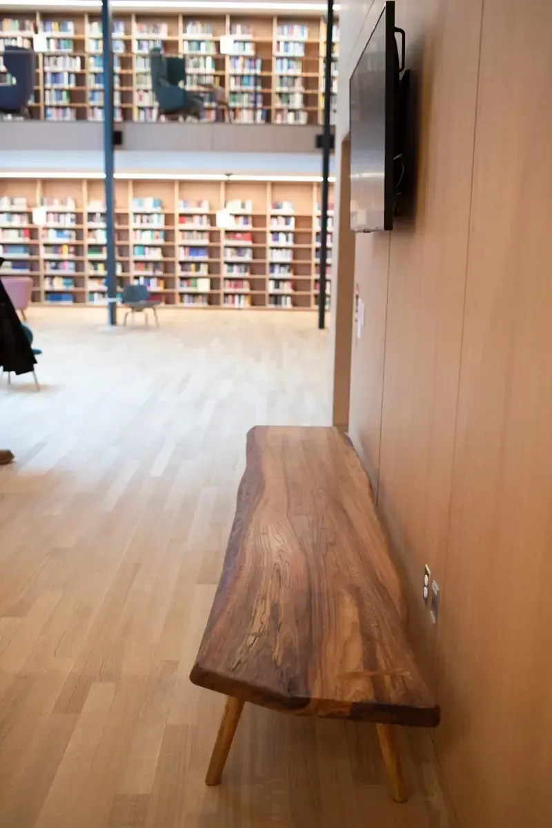 We were honored to have the opportunity to design and craft furniture pieces for the Smith College-Neilson Library. The pieces we created complemented that design of the space and providing accents where needed. We crafted long tables for reading and study, benches with metal bases, low tables, and coffee tables from the trunk of the tree so as to create unique shapes, and visual interest. It was a labor of love that we will cherish forever.